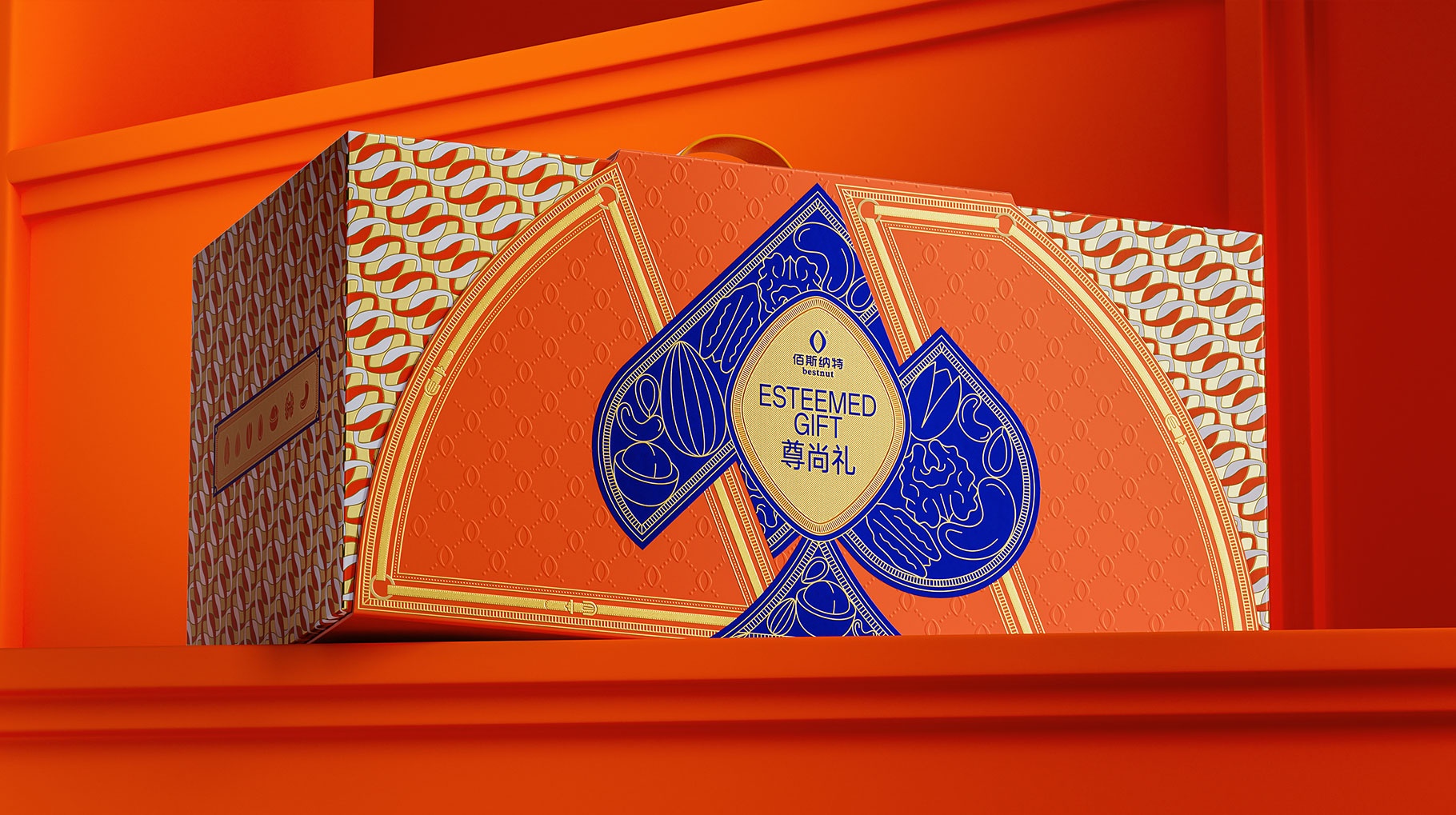 “尊尚礼”这一名称,借 “尚” 所蕴含的崇尚、尊重之意,一方面表达对坚果品质的极致追求,另一方面体现对消费者品味与身份的敬重。整个设计围绕追求高品质生活的消费群体展开,旨在打造出独具特色与格调的坚果礼盒,使其在市场中展现出与众不同的魅力。
