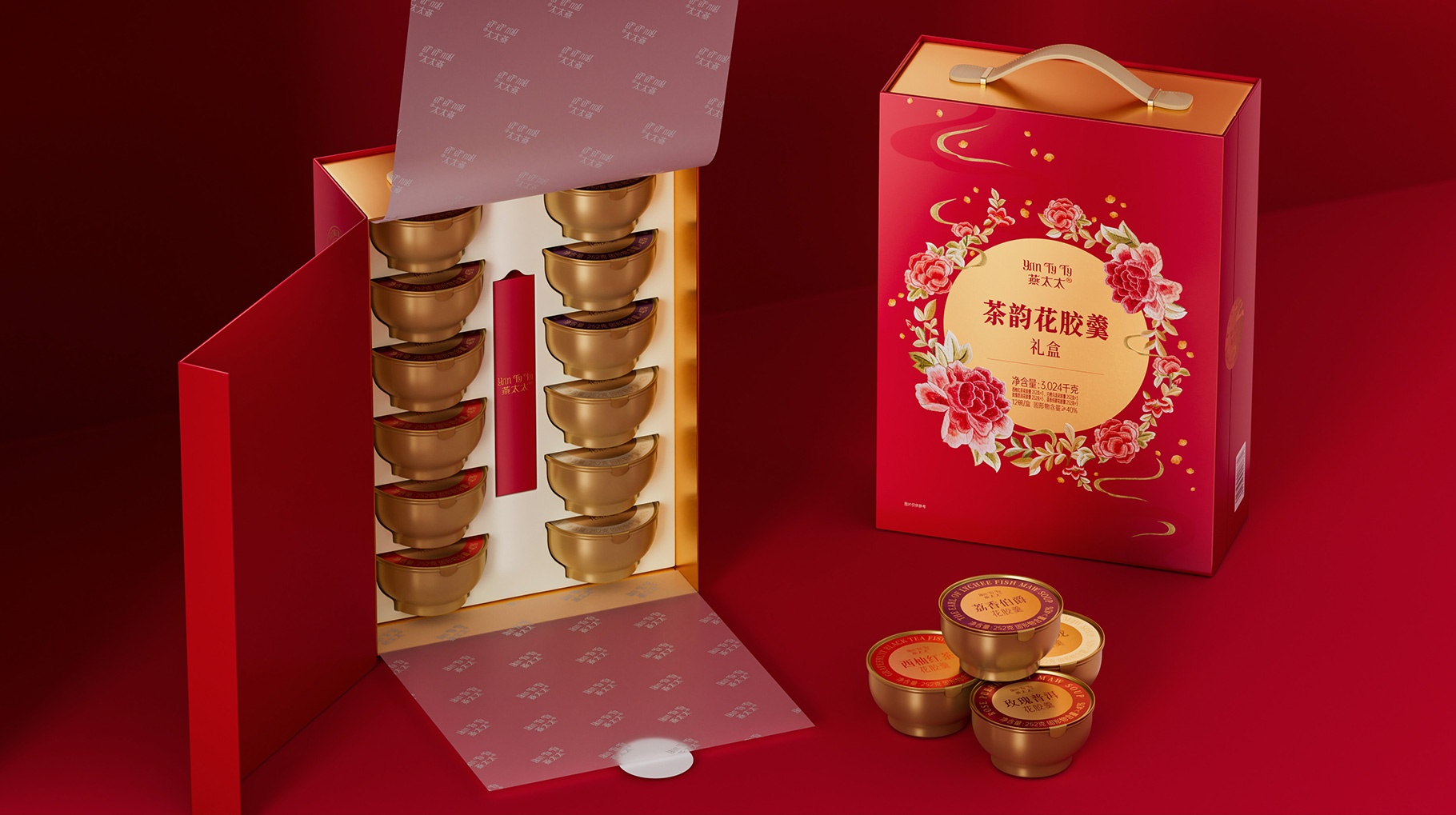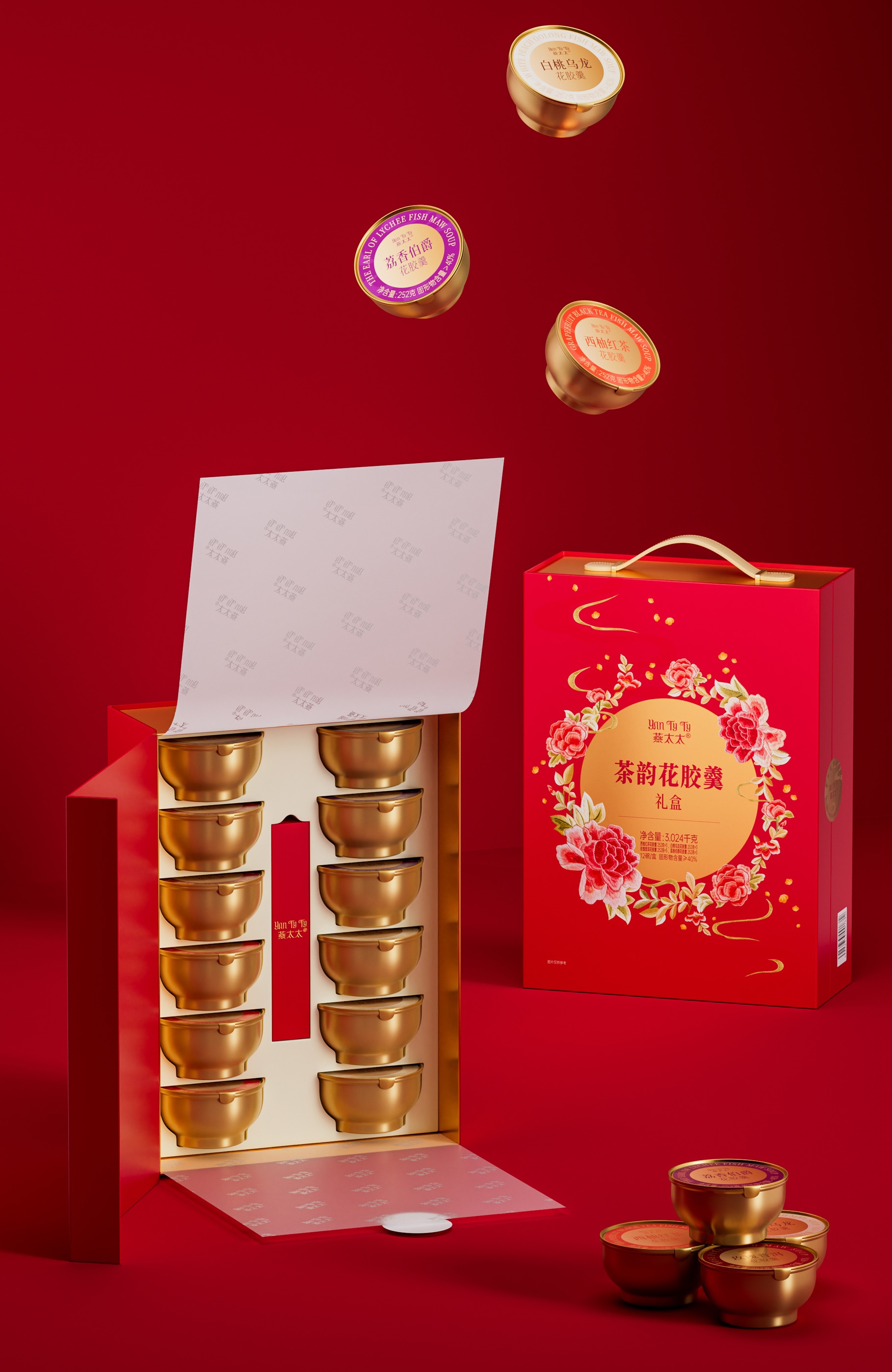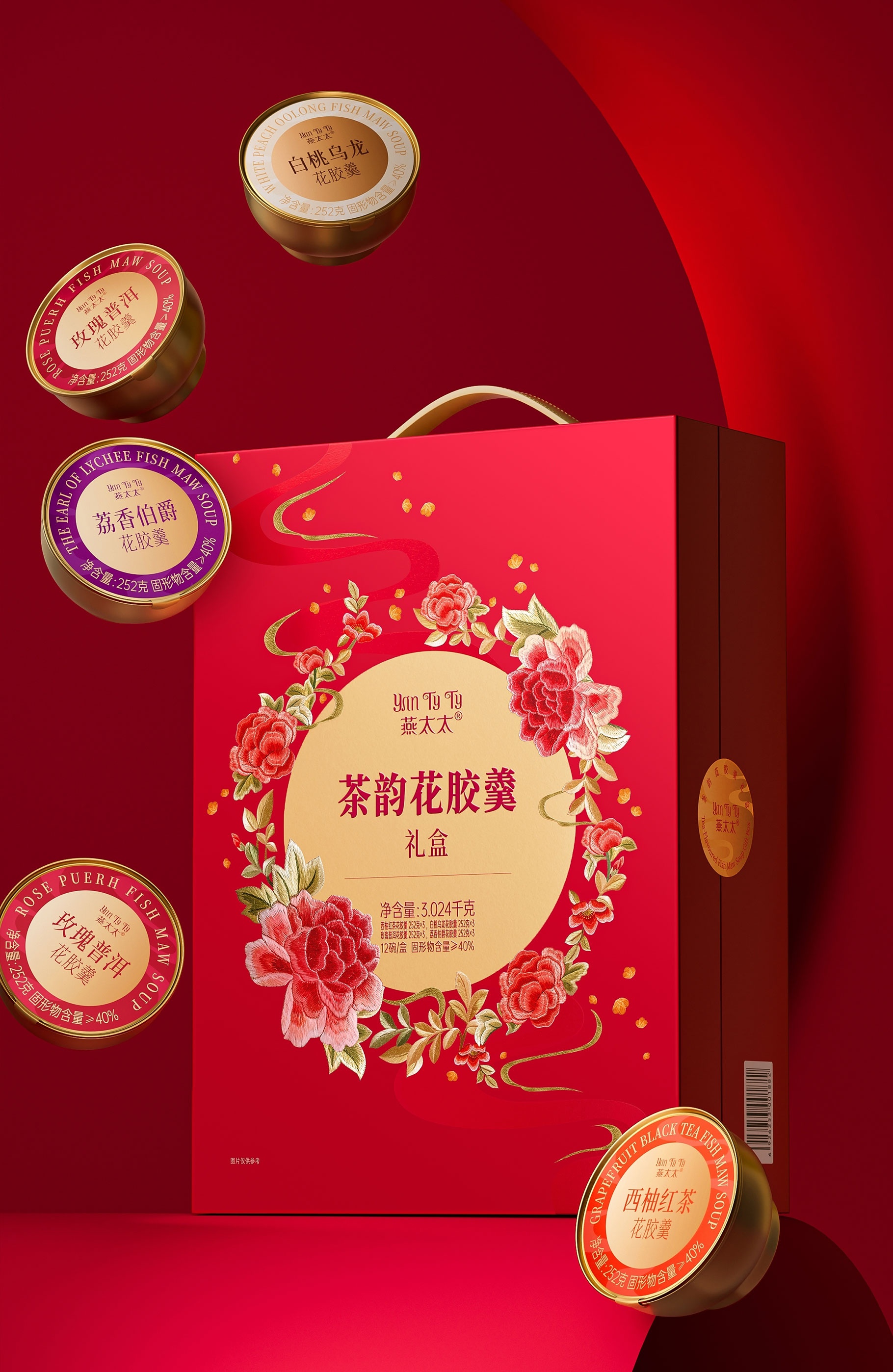 "燕太太"为山姆会员店专供的茶韵花胶羹礼盒:以刺绣工艺为核心,融合花与茶香图腾元素的中秋花胶羹礼盒包装。此设计旨在通过精细的刺绣技艺,展现自然之美、茶香之韵与中秋佳节的和谐氛围,让收礼者在享受美味的同时,也能感受到一份来自传统文化的艺术享受与情感传递。
