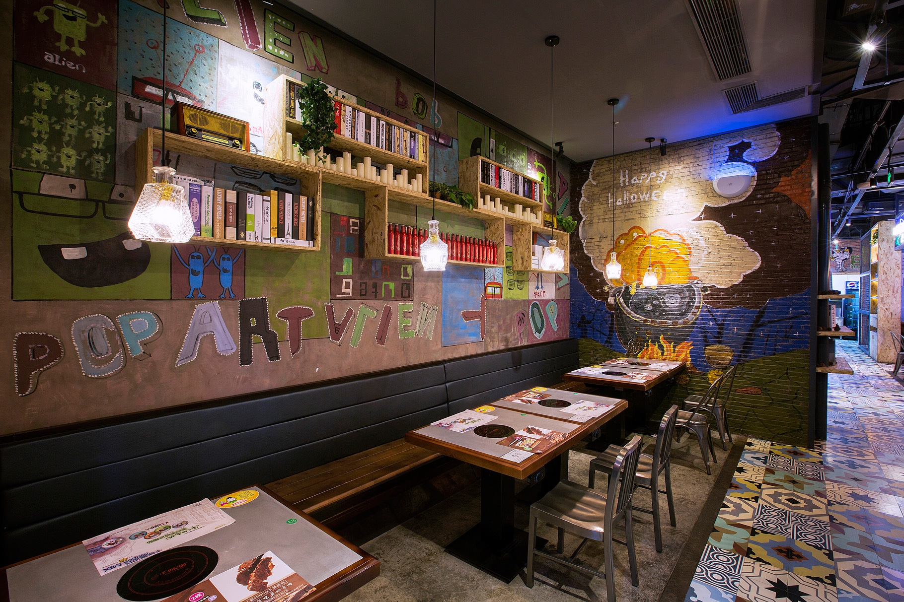 餐厅的设计理念是营造一个充满童趣和欢快轻松的就餐环境,全新店面,将以一种全新的视觉突破和打破以往的装修风格,给消费者一次小小的惊喜。设计师运用了五彩斑斓,并充满了童趣的手绘墙,营造出童话世界的窝心和温暖。依靠合理的空间区域布局将就餐者的用餐空间进行隔离划分,尽可能地保证各自的私有空间,来满足不同就餐者的需求。而采用充满工业风的桌椅,来实现和手绘墙形成了一种视觉差。而这里的火锅原材料是“鲜嫩与自然”为质量保证的,只因想给食客带来一场舌尖上盛宴。