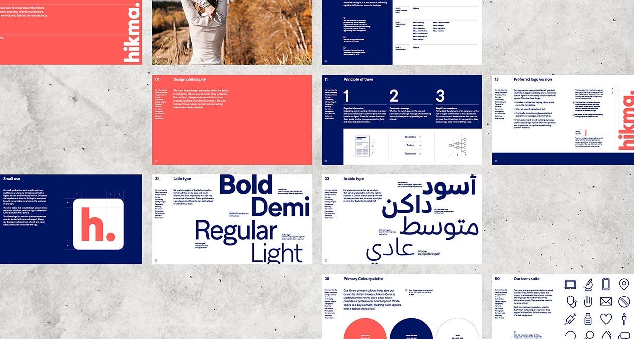 在梳理Hikma品牌架构时,我们发现缓解混乱的解决方案是将所有公司品牌合并为一个全球性主品牌,以便建立内部统一性、一致性和驱动力。我们开发了一个更加相关和数字化的视觉标识,包括刷新的调色板和可访问的现代字体,让Hikma品牌架构在竞争激烈的市场中脱颖而出。