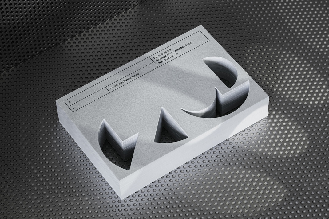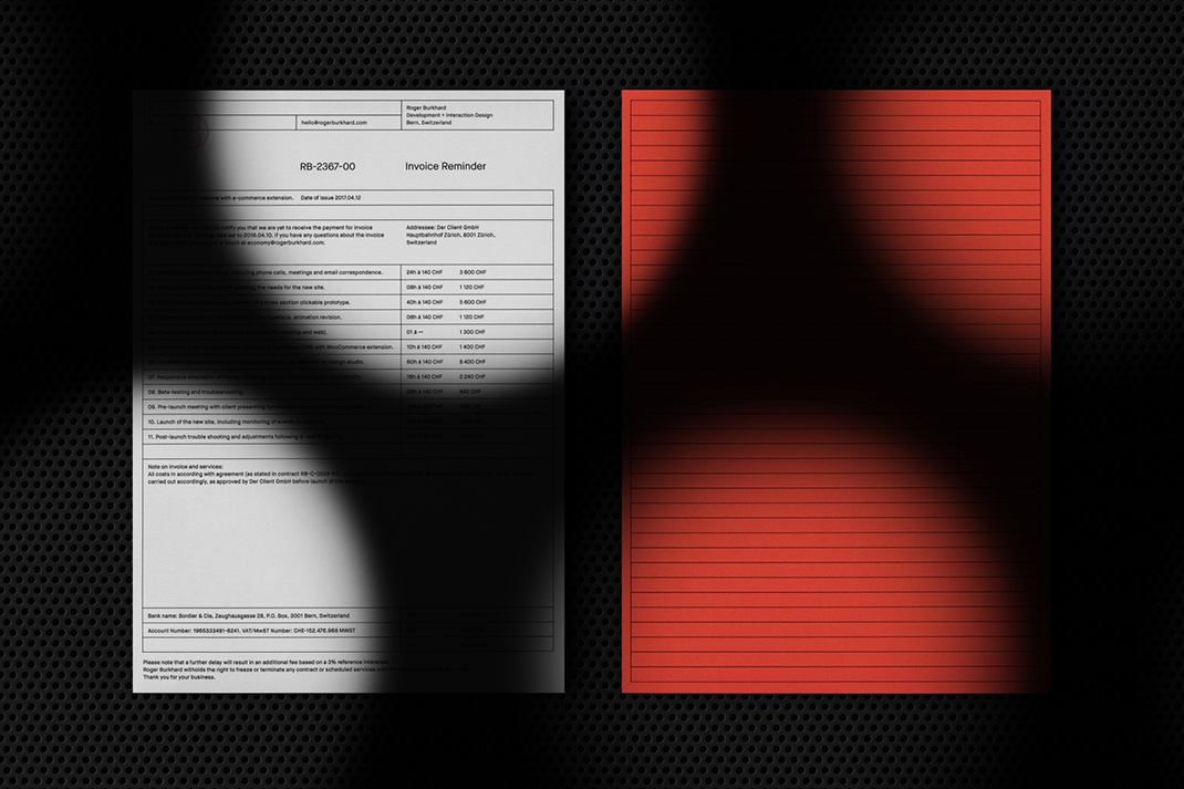 这是一个品牌标识,涉及Roger Burkhard的方法和工作的多层次性质。数字和物质世界的差异得到了很好的解决,从数字设计作为工艺的明显表达,到模切拼图的更微妙的解决问题的本质,最后到脸颊性质的角色和舌头。明亮的荧光橙用于发票提醒。