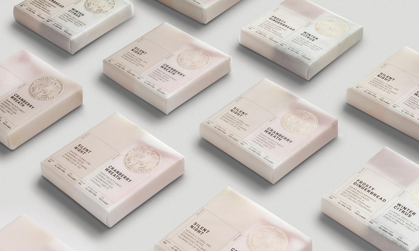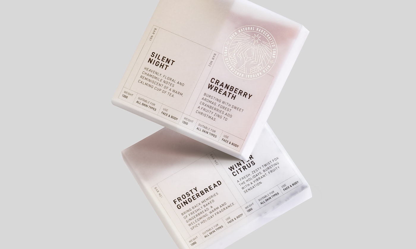 一下是深圳的创作人员的包装设计用很少的装饰和美化,这种用于一对手工皂条的包装专注于其实用性并带出产品的纯度。